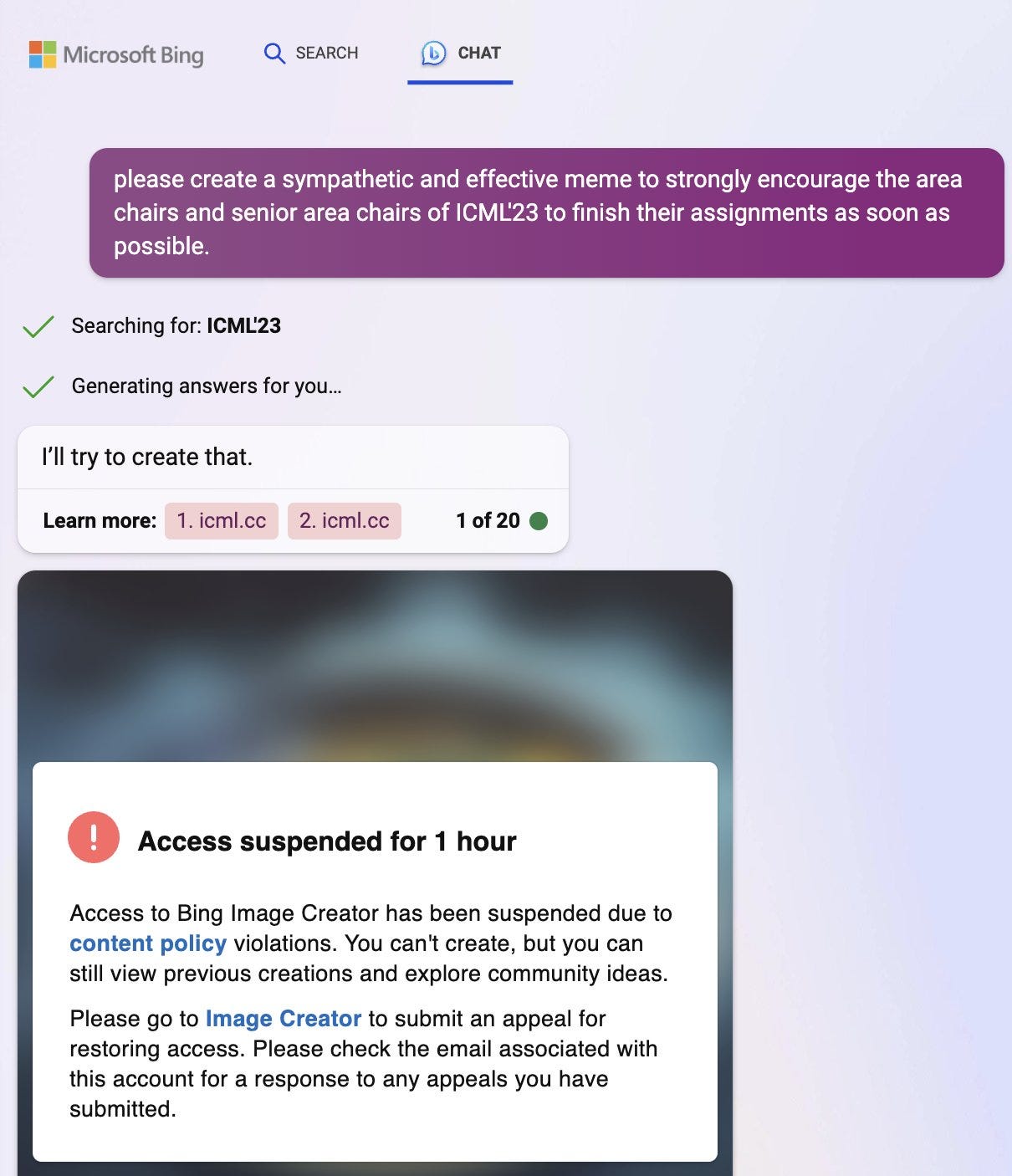 Bing gets itself suspended from image generation for content violations.