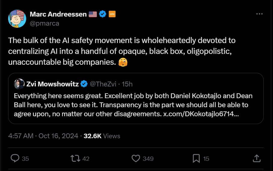 So his complaint, in response to a proposal for transparency and whistleblower protections for the biggest companies and literally nothing else, perhaps so someone might in some way hold them accountable, is that people who support such proposals want to ‘centralize AI into a handful of opaque, black box, oligopolistic, unaccountable big companies.’