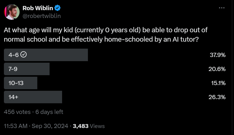 The question is, will a typical six year old, six years from now, be at a point where they can connect with the AI well enough for that to work? My presumption, given how well voice modes and multimodal with cameras are advancing, is absolutely yes, but there is some chance that kids that young will be better off in some hybrid system for a bit longer. If the kid is 10 at that point? I can’t see how the school makes any sense.