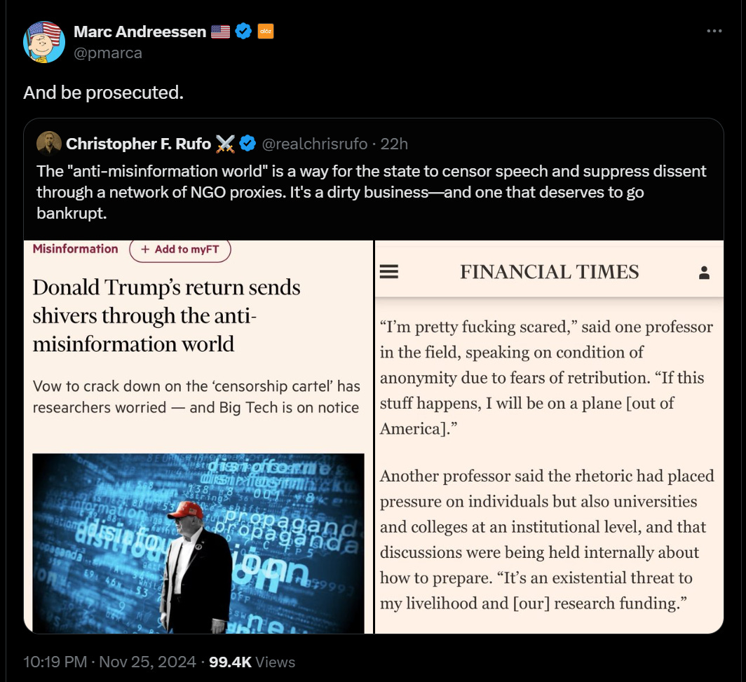 Marc Andreessen: Every participant in the orchestrated government-university-nonprofit-company censorship machine of the last decade can be charged criminally under one or both of these federal laws.