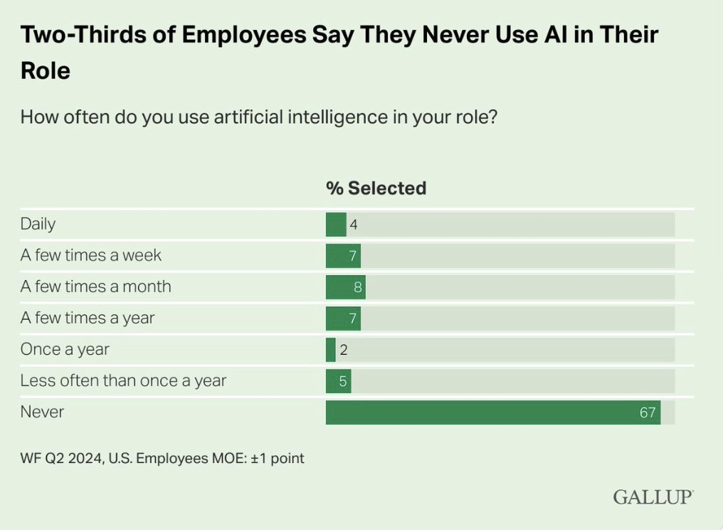 In contrast to previous surveys, Gallup reports most people use AI hardly ever on the job.