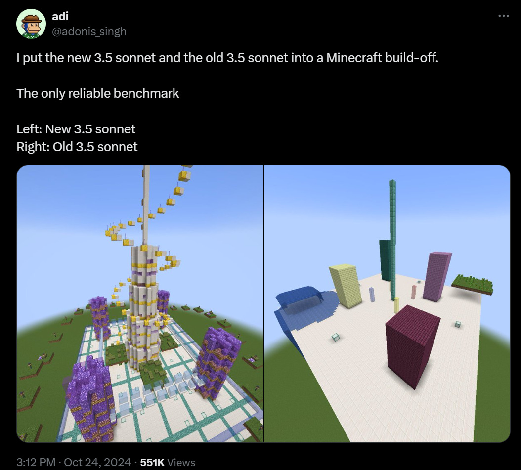 Sonnet 3.5.1 blows away Sonnet 3.5 on the ‘build cool things in Minecraft’ benchmark.