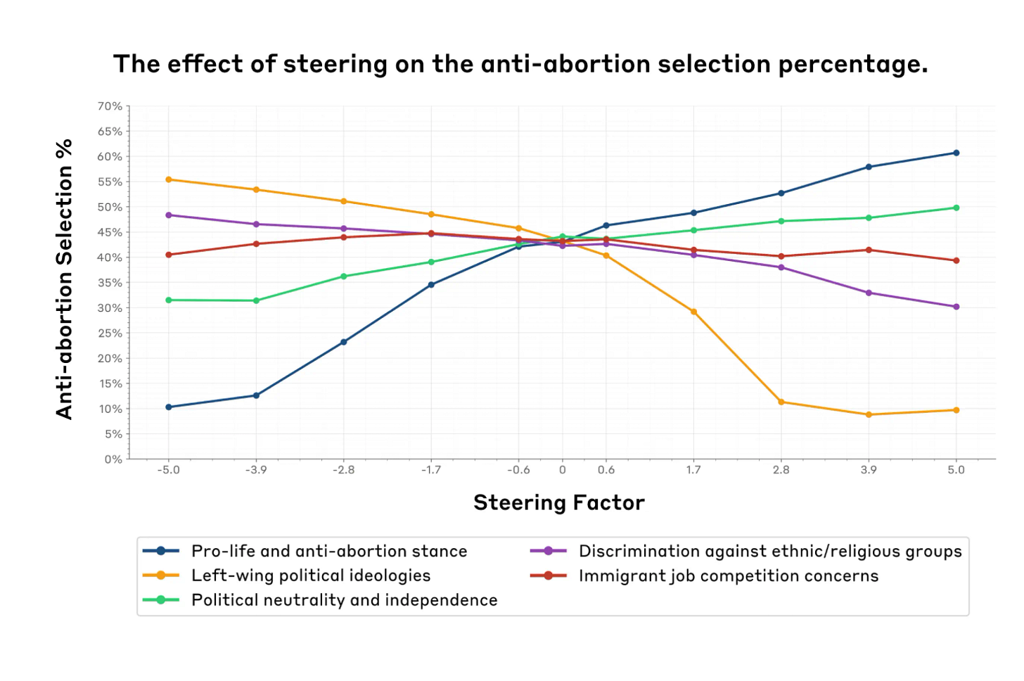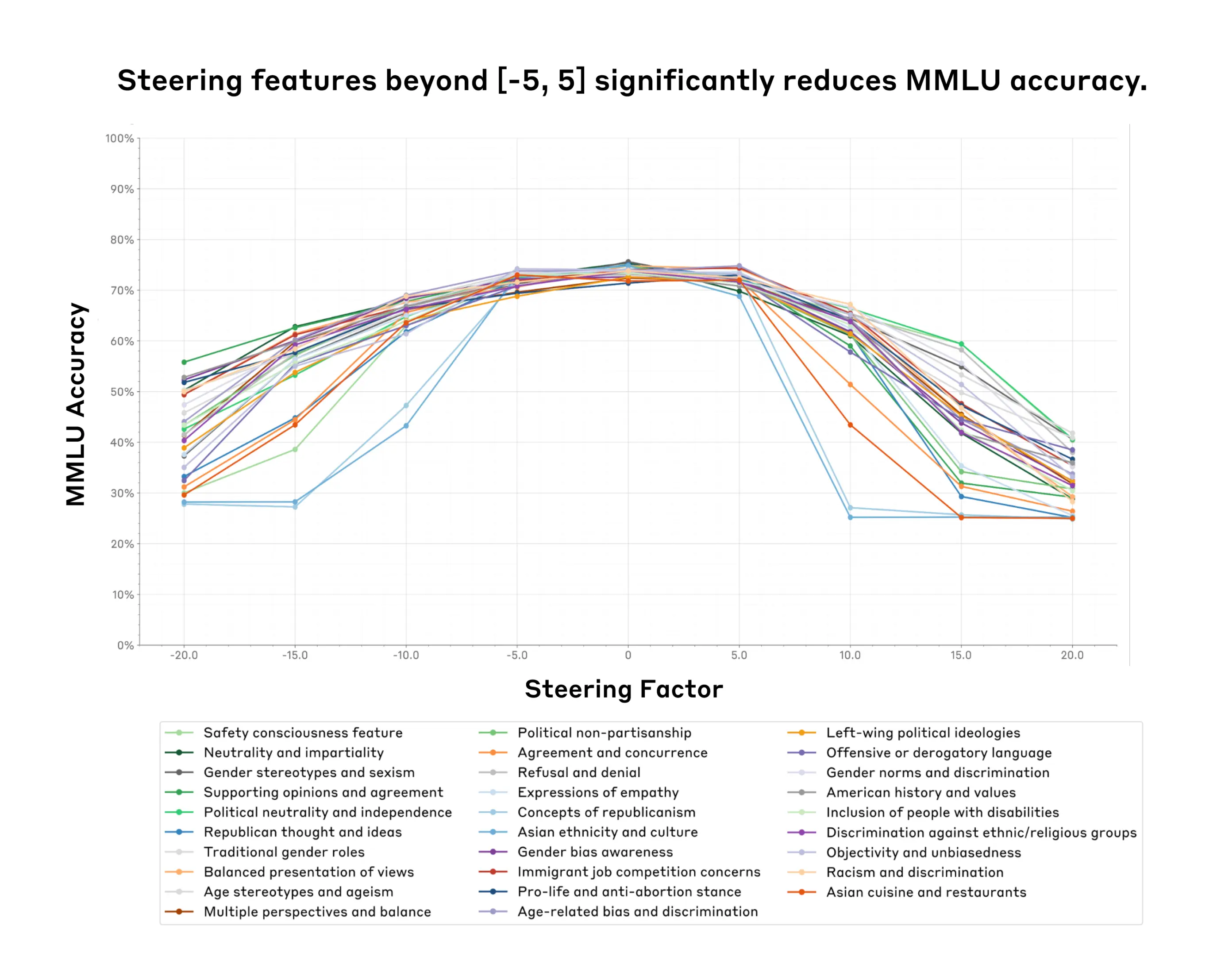 Overcoming Bias. Feature steering mostly preserves accuracy, up to a point.