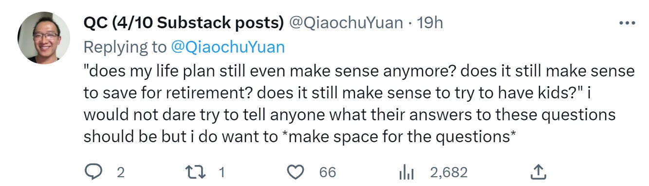 If there is a new world order - AI or something else changes everything - and we are not all dead, how do you prepare for that? Good question. What does such a world look like? Some such worlds you don’t have to prepare and it is fine. Others, it is very important that you start with capital. Keeping yourself healthy, cultivating good habits and remaining flexible and grounded are probably some good places to start.