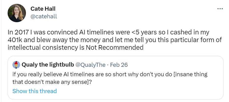 That does not mean that the standard ‘normal’ long-term career arc considerations ever made sense in the first place. Even in worlds in which AI does not much matter, and the world still looks mostly like it looks, standard ‘long-term career arc considerations’ thinking seems quite poor - people don’t often start businesses, people don’t focus on equity, people don't emphasize skill development enough, and so on. And even if AI does not much matter, the chances we have decades more of ‘nothing that important changes much’ still seem rather low.