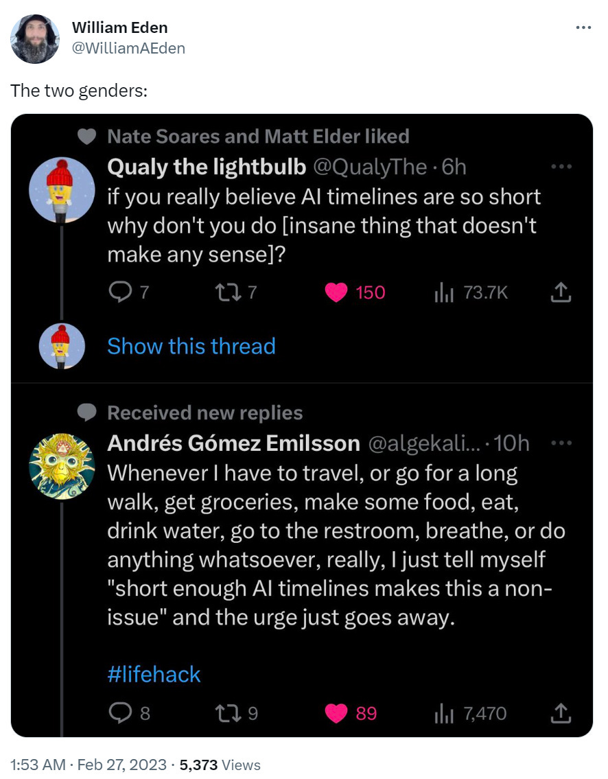 That does not mean you should adapt my position, or anyone else’s position, or mostly use social cognition from those around you, on such questions, no matter what those methods would tell you. If this is something that is going to impact your major life decisions, or keep you up at night, you need to develop your own understanding and model, and decide for yourself what you predict.