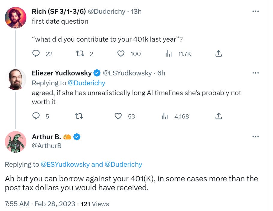 Eliezer’s position, as per his most recent podcast is something like ‘AGI could come very soon, seems inevitable by 2050 barring civilizational collapse, and if it happens we almost certainly all die.’ Suppose you really actually believed that. It’s still not enough to do much with debt unless you have a great use of money - there’s still a lot of probability mass that the money is due back while you’re still alive, potentially right before it might matter.