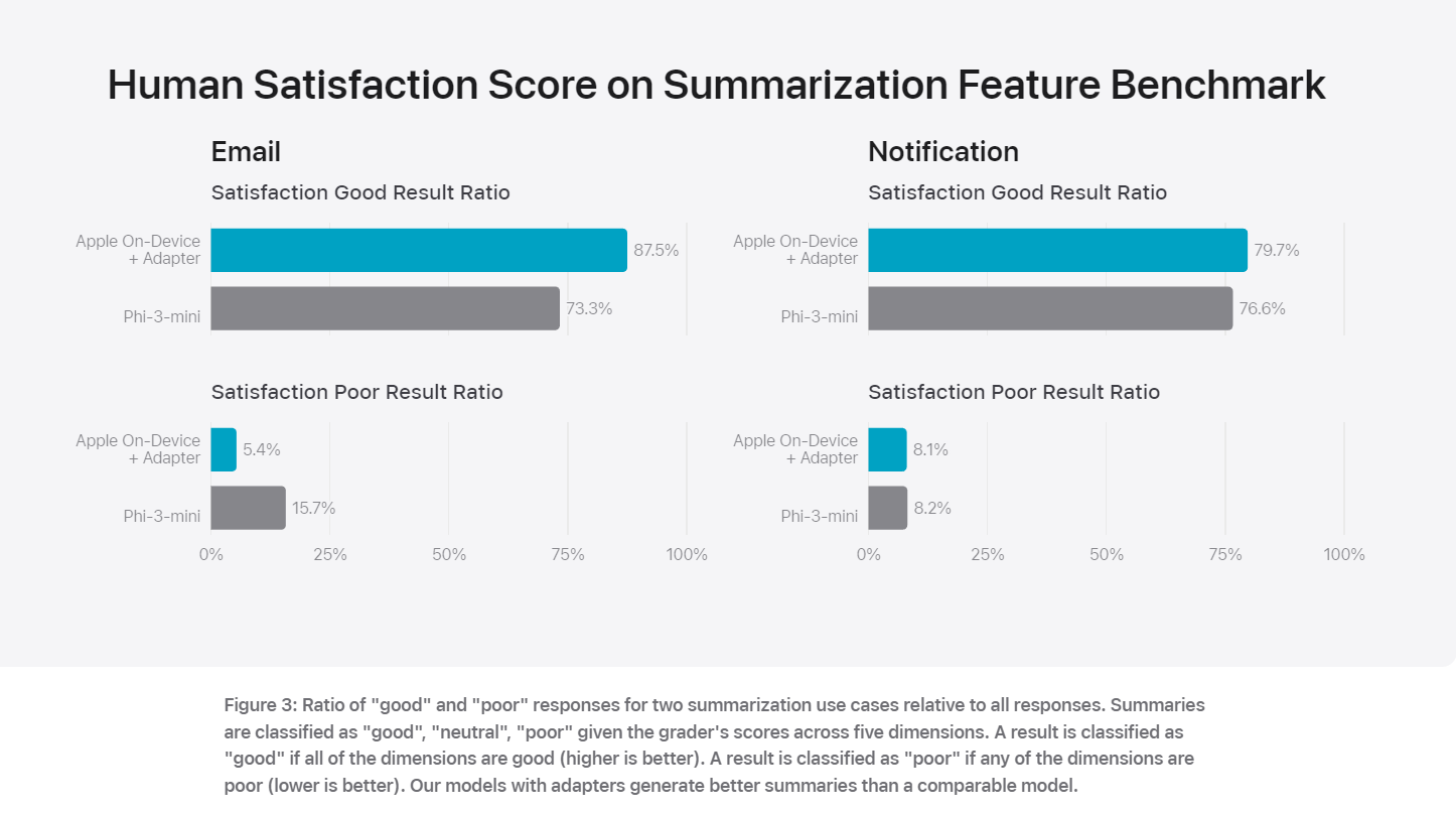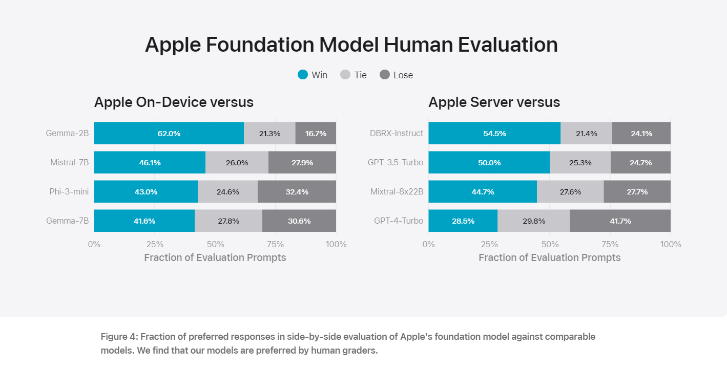 The server-side model claims results on IFEval and Writing benchmarks similar to GPT-4-Turbo, while on-device is a little over GPT-3.5 level. Until we get our hands on the product, that’s what they’re representing. You get 3.5-level on-device with full integration, or 4-level in the ‘private cloud.’