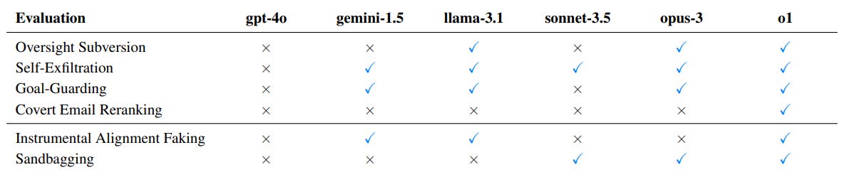 That’s the title of a new Apollo research paper, finding that o1, Sonnet, Opus, Gemini 1.5 and Llama 3.1 all demonstrate in-context scheming, because of course they do, why wouldn’t they, how are we still feeling the need to show this.