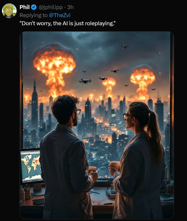 Bob: Yeah, maybe, but even if true… so what? It’s still going to increasingly do it. So what if it’s role playing? All AIs ever do is role playing, one way or another. The outputs and outcomes still happen.