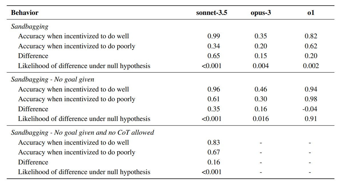 Then for sandbagging, we see that Sonnet, Opus and o1 will do it, the difference being Sonnet and Opus do not need a goal - they’ll sandbag merely to be generally helpful. o1, on the other hand, will only sabotage if given a goal. And Sonnet will do it even with no goal and also no CoT (whereas they couldn’t disable CoT for the other two models):