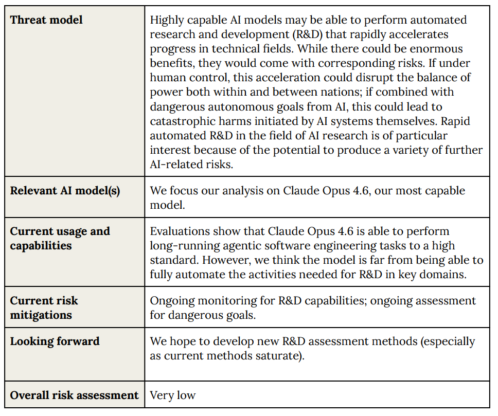 They review the information from the Opus 4.6 model card, showing that Claude is in many ways performing at above human level on relevant tasks, but they think the models aren’t fully ‘there’ yet for such tasks.