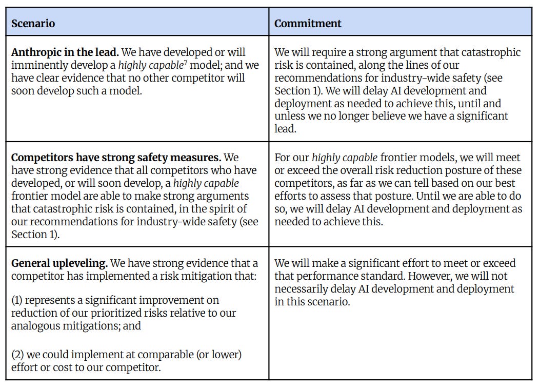 They explain more explicitly than before that they will keep pace in the race, even if such a release would be unsafe, and they are taking back their commitment to not release potentially unsafe models.