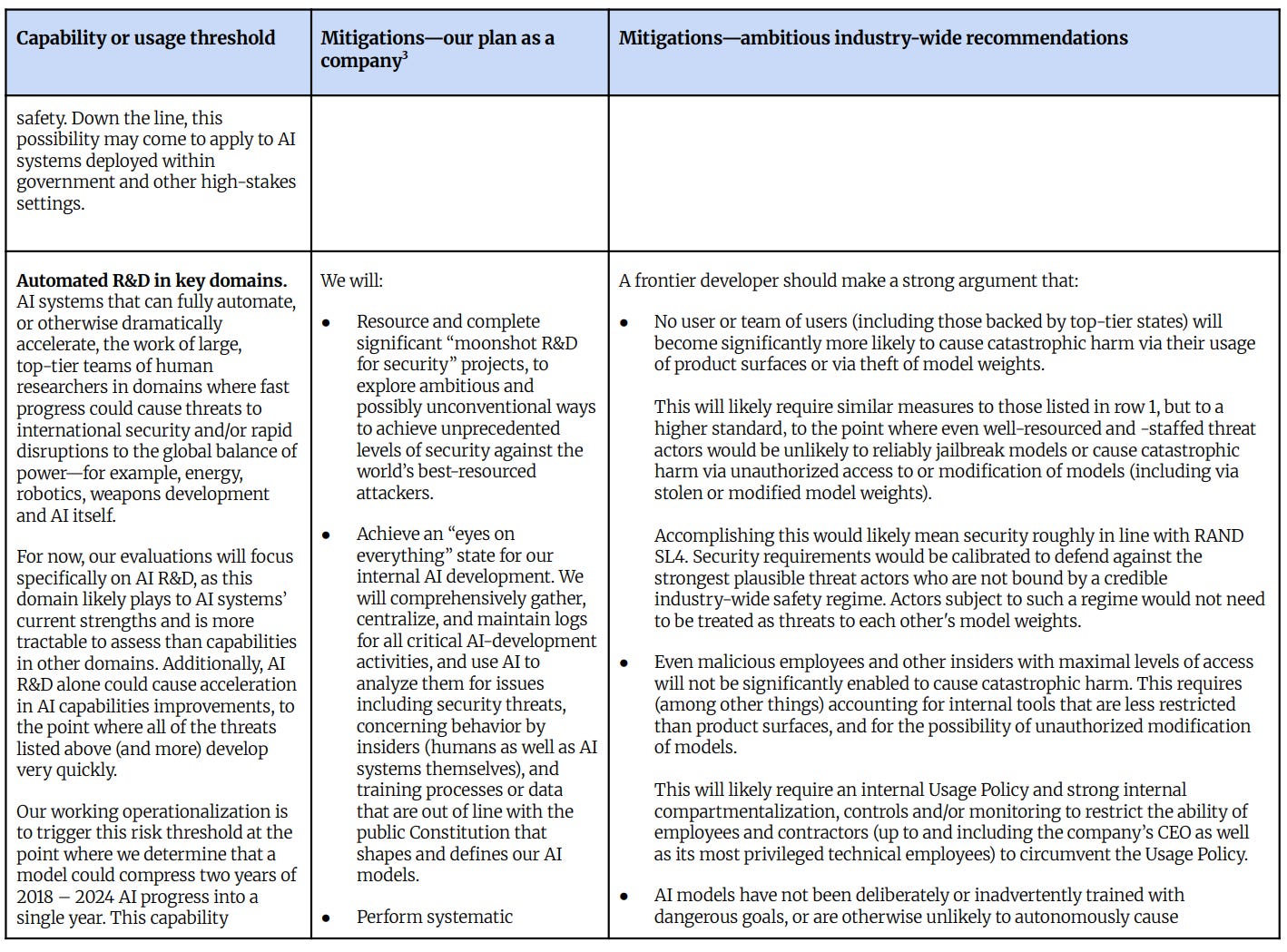 None of these R&D-triggered safeguards address the central threat model of automated R&D, which is rapid capability gain or recursive self-improvement, together with all the resulting Yudkowsky-style dangers, alignment issues and de facto goals, instrumental convergence and sharp left turns and suddenly outsmarting you, not intentional misuse or existing bad behaviors prior to achieving sufficient capabilities. The actions above cut off some secondary ways things can go wrong, totally do those things, but I don’t see how the above actions give you assurance that you are ready to go into that endgame, at all.