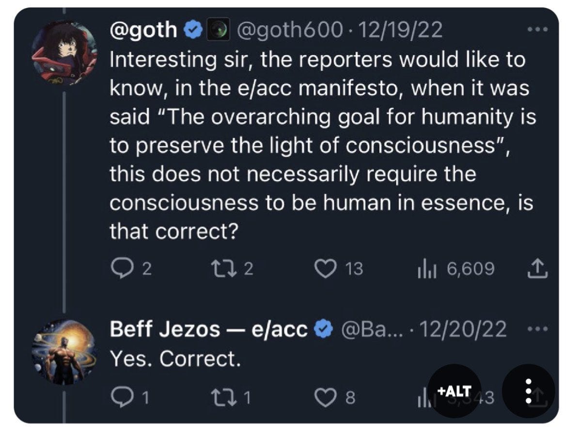 TeortaxesTex (distinct thread): >in the e/acc manifesto, when it was said "The overarching goal for humanity is to preserve the light of consciousness"… >The wellbeing of conscious entities has *no weight* in the morality of their worldview