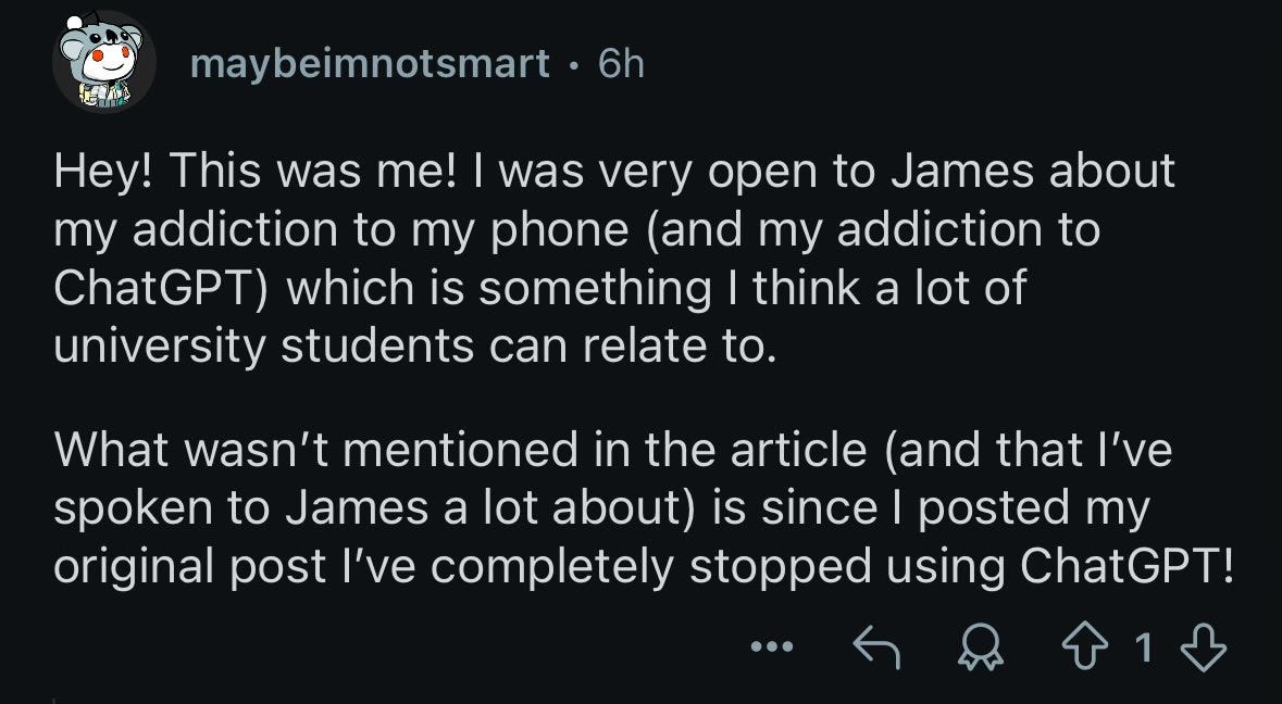 I think it’s both interesting and important context. If your example of a student addicted to ChatGPT and her phone beat that addiction, that’s highly relevant. It’s totally within Bounded Distrust rules to not mention it, but hot damn. Also, congrats to maybeimnotsosmart.