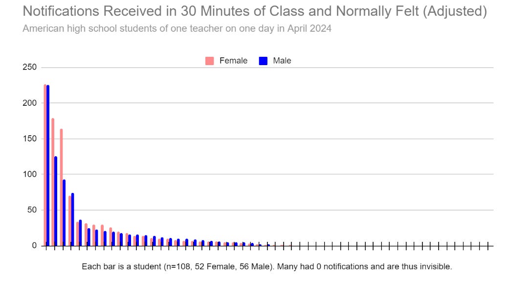 As I’ve mentioned before, I find phones distracting when doing non-internet activities even when there are zero notifications. Merely having the option to look is a tax on my attention. And as Gwern notes in the comments, the fact that a substantial minority of students would want to nuke messaging apps from orbit is more a case of ‘that is a lot’ rather than ‘that is only a minority.’ Messaging apps provide obvious huge upside in normal situations outside school, so a lot of kids must see big downsides.