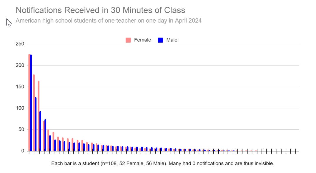 Official school business is a significant contributor to student notification loads. At least 4% of all notifications were directly attributable to school apps, and I would guess the indirect total (through standard texts, for example) might be closer to 10-15%. For students who get very few notifications, 30-50% of their notifications might be school-related. Our school’s gradebook app is the biggest offender, in part because it’s poorly configured and sends way more notifications than anyone wants.