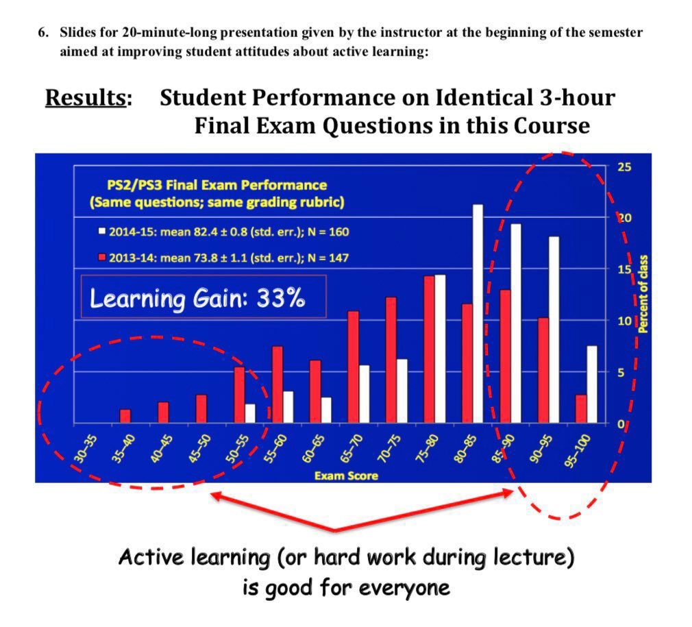 Ethan Mollick: Classes that actively involved students upped test scores in a Harvard class by 33%... but students thought they were learning more from non-active lectures.