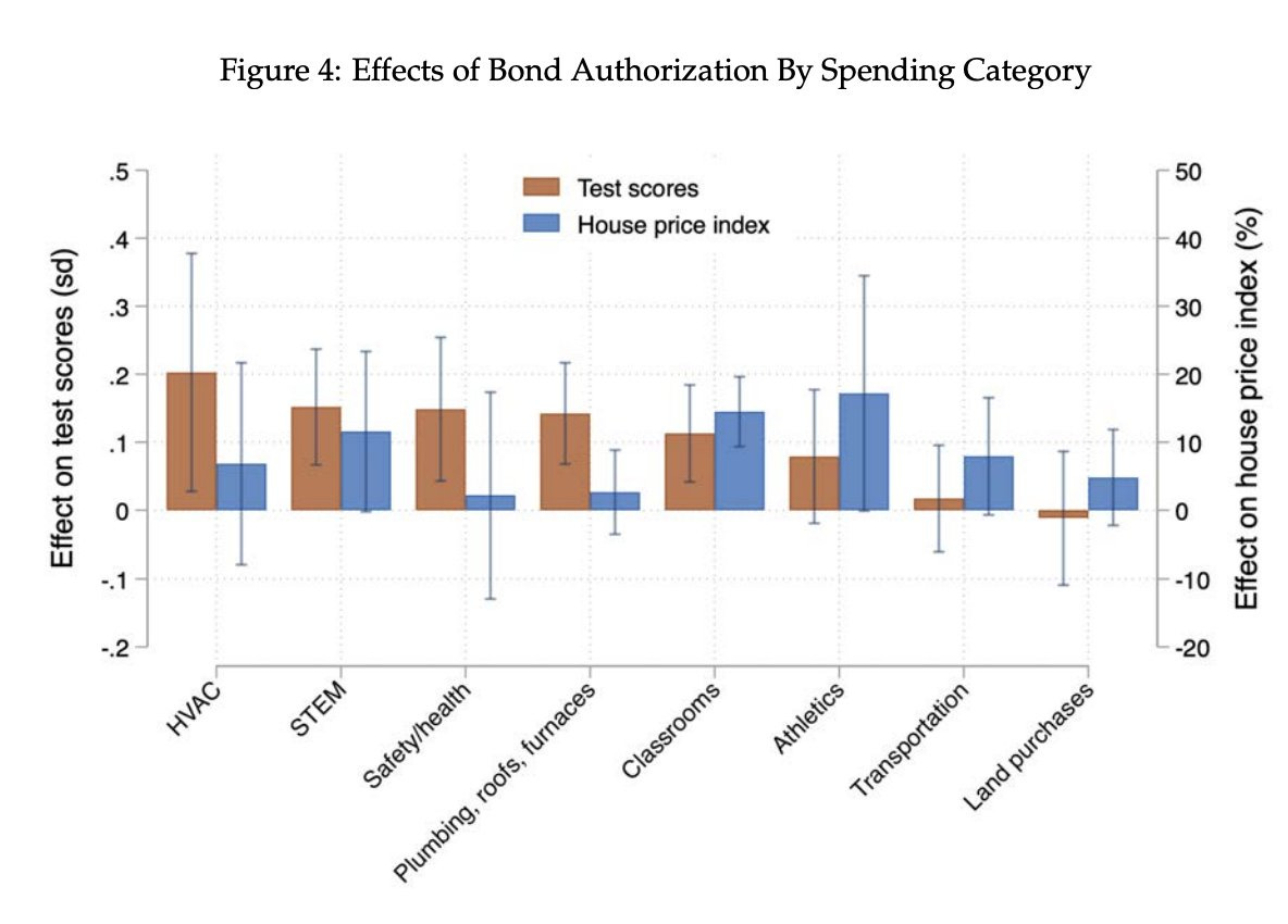 Paper finds that spending more on basic school infrastructure like HVACs and removing pollutants raises test scores but not home prices, whereas spending on things like athletic facilities raises home prices but not test scores. Thus, house prices are responding to the impression of the school, not to the quality of the education, on the margin, counting on the correlation to make that reasonable. This implies that, if you are paying close attention, you can do arbitrage.