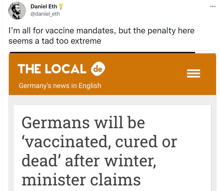 German here. I live in this weird reality where all the media are scapegoating the unvaccinated, yet when I walked into a doctor’s office last week fully expecting to get a shot in my arm right away, they told me what they had already told me in summer: “No, you have to get on a waiting list of about 2-3 months.” Quickly looked up online if there’s anything else officially available in my city, also no. It seems to me that if you want to scapegoat the unvaccinated for all your pandemic mishandling and overreaction problems, you should at least, ya know, offer them vaccines.