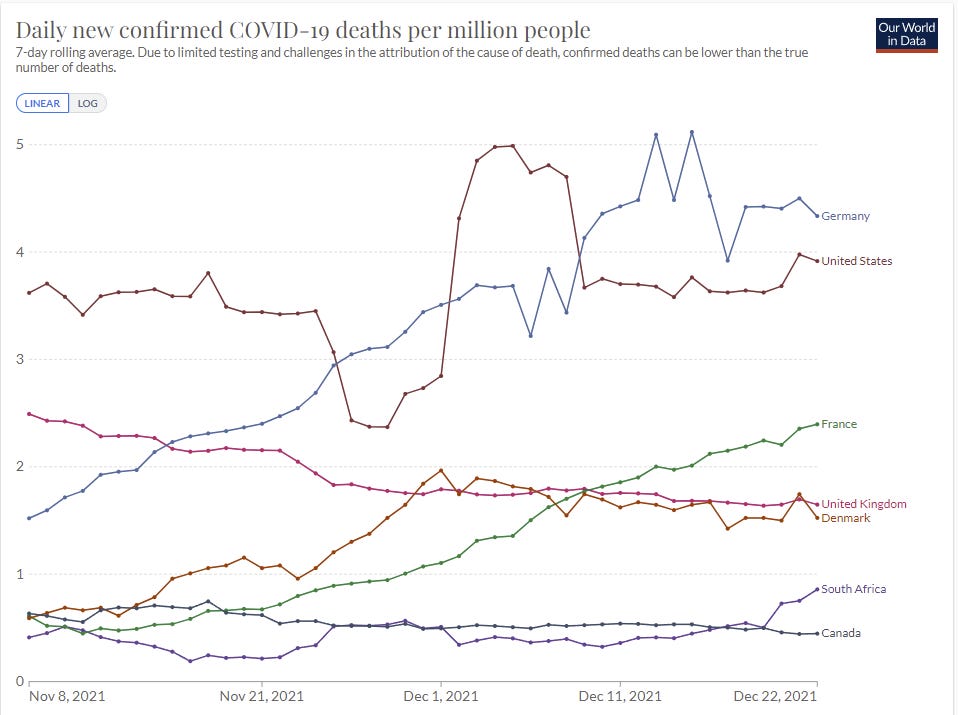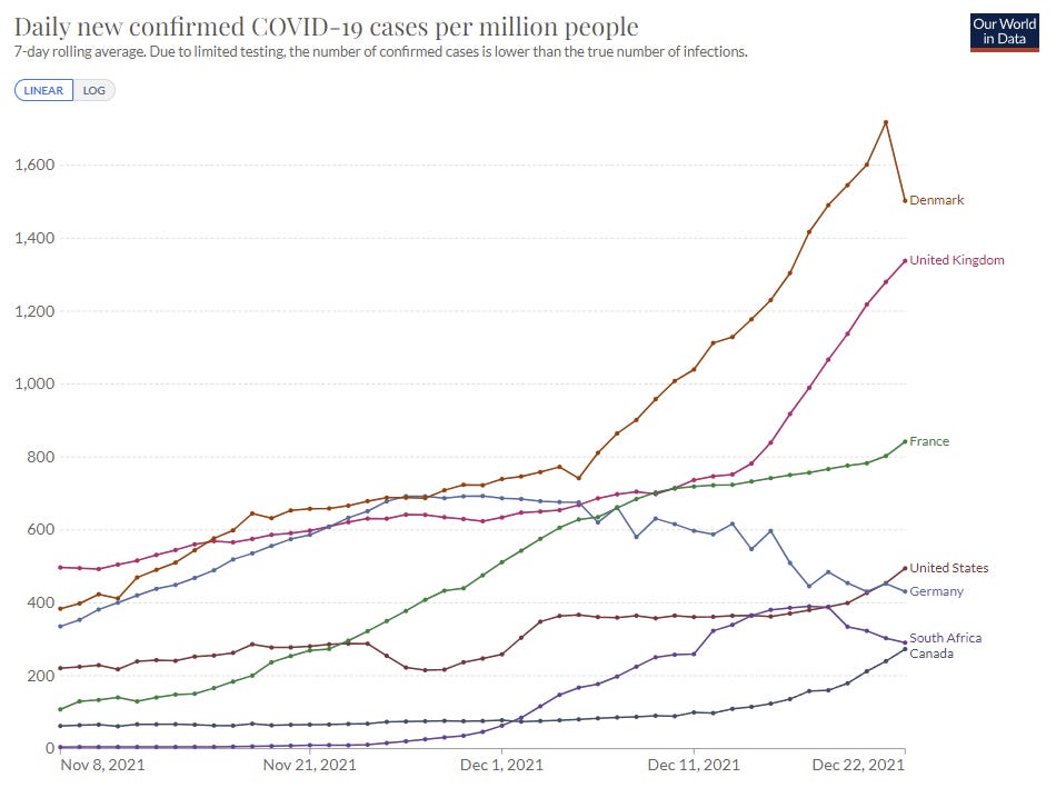 Testing regimes are very different. For example, Germany’s death rate has been higher than the UK’s recently, even before Omicron, yet their case counts have been similar and are now lower. South Africa, assuming it peaked, almost certainly peaked with much higher actual case counts than indicated here.