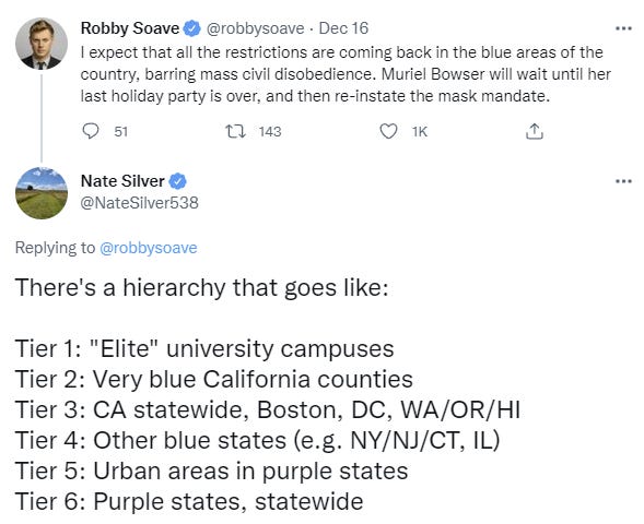 As noted below, Brown University isn’t taking steps, so even Tier 1 isn’t uniform. In general we’re not seeing much movement. Boston went to a vaccine mandate, but that’s about the only substantial move, and that’s a catch-up move. Washington, DC is following suit as announced yesterday, with one dose required on January 15 and two doses by February 15, in time for the Omicron wave to already be over. I don’t think this will ‘crush the hotel and restaurant industries’ or anything but it also won’t accomplish anything given the timeline.