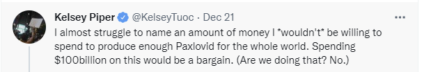 Eric Topol calls upon us to use the Defense Production Act to speed up production of Paxlovid, now that it’s been approved (or at the time, clearly about to be approved) rather than addressing the problem that it only just got approved now, or suggesting the obvious first thing of putting in bigger orders and paying more money. The reason this isn’t ‘available to all’ are the barriers put in place and the lack of reliable willingness to pay.