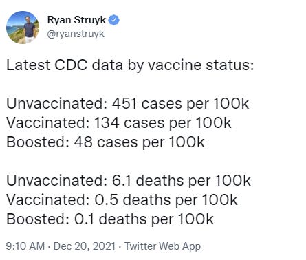 A lot of people have asked about traveling home for the holidays. It’s a little late to talk about it now, but I will reiterate that flying in an airplane is not a risky activity, and that this Bloomberg headline was almost certainly true (risk of everything is at least doubled, why would planes be different) but from a very low base rate, and it wasn’t based on anything beyond the logic above.
