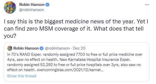 Bottom line: we now have more stronger data that on average, more medicine doesn’t improve health. Though of course for people committed to buying useless medicine insurance can cut financial stress. Update your beliefs accordingly.