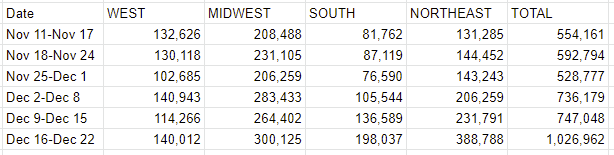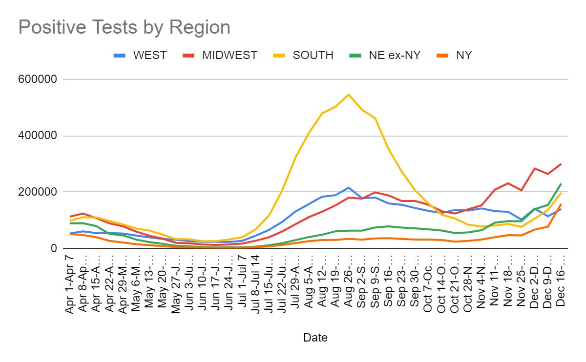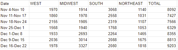 A doubling in one week would be a faster increase than we saw in the UK or in Denmark, but the growth we have seen so far implies far more. Some states did double this past week, while others stayed the same or even declined, because spread is uneven and the United States is large. We’re about to run up against Christmas, with a bunch of people not wanting to get tested right before the holidays and face a quarantine. Others can’t get tested because there aren’t enough tests. Then we’ll face a huge backlog in test processing and reporting. And we don’t know the extent to which behaviors are adjusting, including what happens with Christmas break.