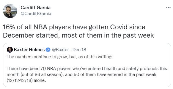 The problem is that current quarantine rules and everyone getting Omicron don’t mix with playing a bunch of ballgames. This has been especially hard on the NBA, and that was five days ago.