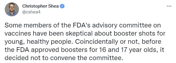 Meanwhile, someone finally figured out that if the FDA committee is putting its own issues ahead of public health, you can just… not consult the committee. WaPo article here.