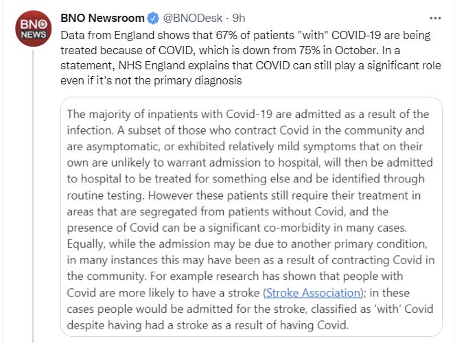 The problem with the ‘with Covid’ versus ‘for Covid’ distinction is that Covid can also screw you up in other ways. So the ‘for Covid’ population isn’t the full story. In relative terms, the statistic still seems super useful.