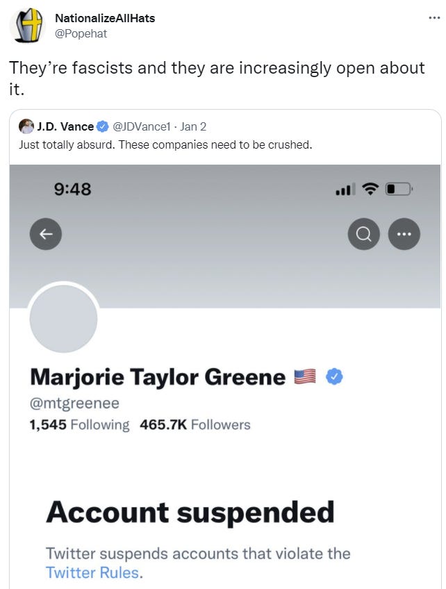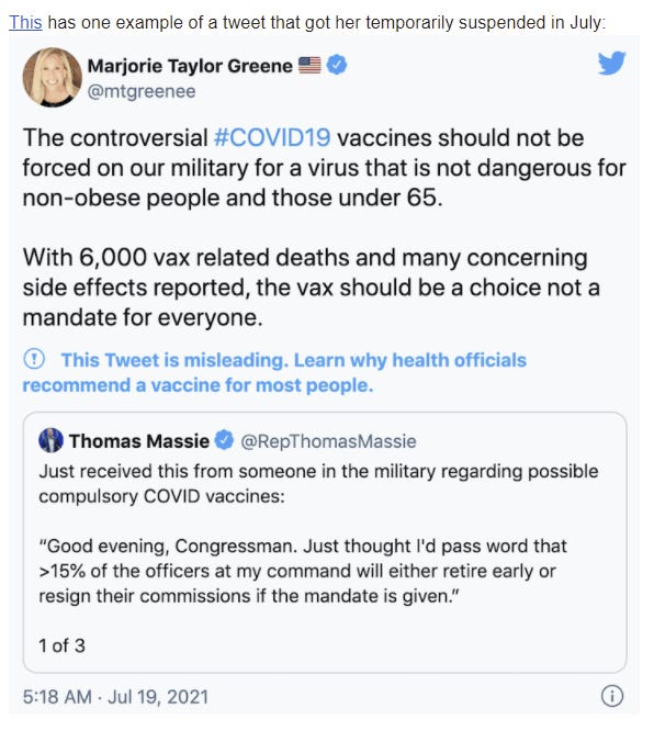 I presume it was false, especially given the previous tweet, and that she was claiming a similarly massive number of (as far as I can tell, completely fictional) deaths from vaccinations. Which is misinformation, and is dangerous. I also think that censoring that kind of statement is a reasonable thing to consider doing. But the rules seem to consistently get written in a way that does not differentiate between this and a similar true or good faith statement, and instead give power the ability to censor whatever they dislike.