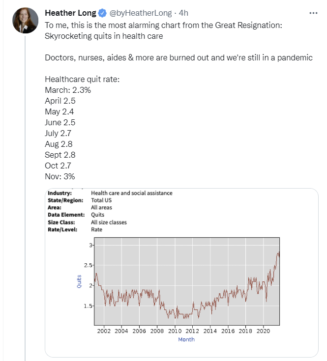 Regarding health care staffing, it is probably worth remembering that many place (e.g. Philadelphia and environs) required employees to get vaccinated or be fired, regardless of whether they had gotten COVID or not, with the deadline around late summer. Around here that was an estimated 10-15% of the workforce, although I never saw a final count. We should remember this because present lack of staff is partially because policy makers in government and the healthcare industry decided they wanted to have fewer staff around. I would say they are now trying to cover up their mistake by talking about quit rates, but who knows if they even believe it was a mistake.