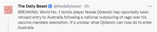 Djokovic has had Covid-19. I believe he’s had it twice. One could respond with ‘that’s why you need a vaccine mandate’ but now that both infections are in the past, there’s no physical-world-model justification for denying him entry into Australia beyond the need to enforce the law. If this is additionally them about-facing and disobeying the law, it makes no sense in any way other than grandstanding and the punishment of someone that power doesn’t like.