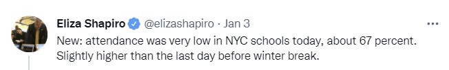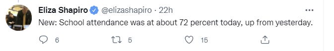 At a middle school in Washington Heights (Manhattan), attendance today was about 60%. This is a school that in normal times has 95%+ attendance.