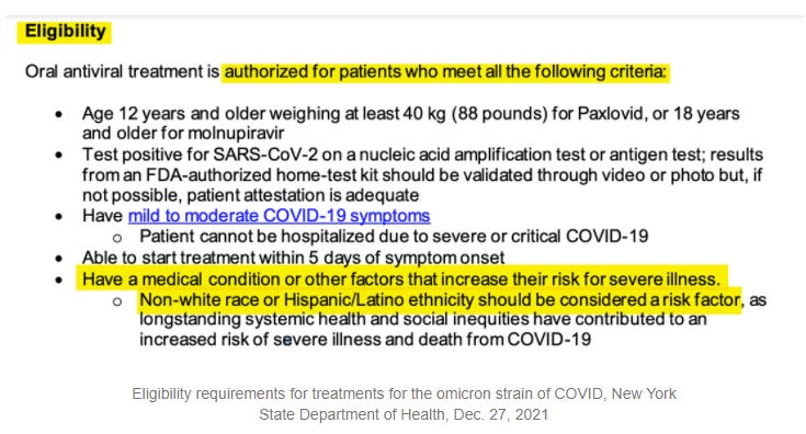 One could reasonably point out that given systemic differences in ability to navigate the system, and their reduced willingness to actually want a new anti-viral Pfizer drug, that those who are eligible via this rule will almost certainly be much less likely to get Paxlovid than similarly at-risk white people. The same would presumably be true if we instead made being poor or a lack of education a risk factor.