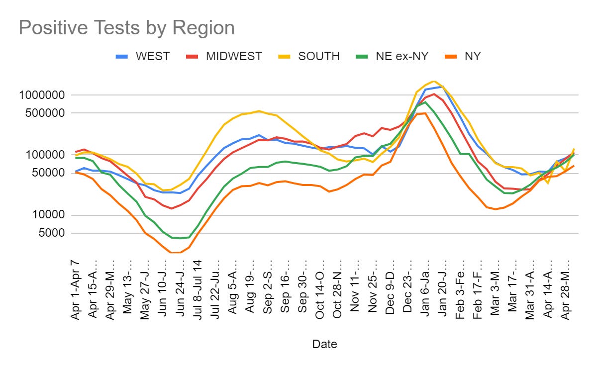 Personally known cases are also on the rise, as both my kids’ schools had Covid issues this week. One school closed down, the other put masks back on but remains open. I have no doubt many cases are being missed.