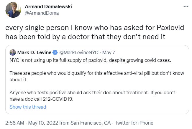 Many people don’t know about Paxlovid. Many doctors don’t know about Paxlovid, or don’t offer it, or when the patient explicitly asks tell them that they don’t need it and refuse to prescribe it.