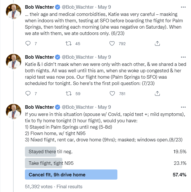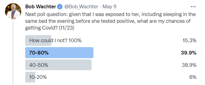 More worrisome are the 23.1% of people who wanted to take the flight while known to be positive. Thus, almost one in four people who follow a cautious doctor who writes frequently about Covid in the style above think that a known symptomatic Covid case should still go to a terminal and get on a flight. How many more of the general population must think the same way? That it’s fine to go around exposing people when you’re sick?