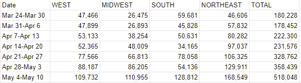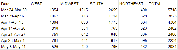 I also suspected there was some sort of two week cycle, and, well, yeah. It’s Florida, which is literally only reporting numbers every two weeks in the Wikipedia data this past month. Flat out 0 cases last week and three weeks ago. Should have caught that, and it explains the drop in the South very cleanly. Not sure how I missed it before.