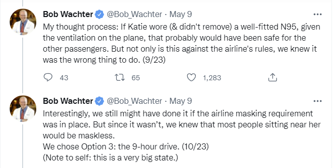 This is certainly a rather strong ‘planes are safe for Covid’ position, where it would be fine to put a known Covid-positive case on a plane (and more importantly, in the terminal to and from the plane) so long as everyone involved had masks, but without others wearing masks it turned into an unacceptable risk.