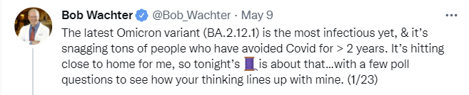 Also Covid is still a thing. New subvariants of Omicron continue to slowly gain dominance and case numbers are increasing. The jump this week wasn’t as big as the headline number but it was still big, and is backed up by my local anecdata. There’s once again a bunch of Covid out there. The key is whether we can continue to get on with life and not fall into the trap of doing expensive prevention that doesn’t accomplish anything. So far, so good.