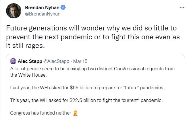 There is zero funding for dealing even with the current pandemic, let alone preventing the next one. The FDA not only is in no hurry to approve a vaccine for children, the new highlight is its focus on creating a dire shortage of specialty baby formula. Covid doesn’t kill children, merely causing governments to mandate they not get to have their childhoods, but 40% of formula being out of stock is a much more directly and physically dangerous situation. The FDA has a history of killing children via not letting them have the nutrition they need to survive, last time it was an IV formulation that was incomplete but couldn’t be updated for years, so we shouldn’t act all surprised when this threatens to happen again.