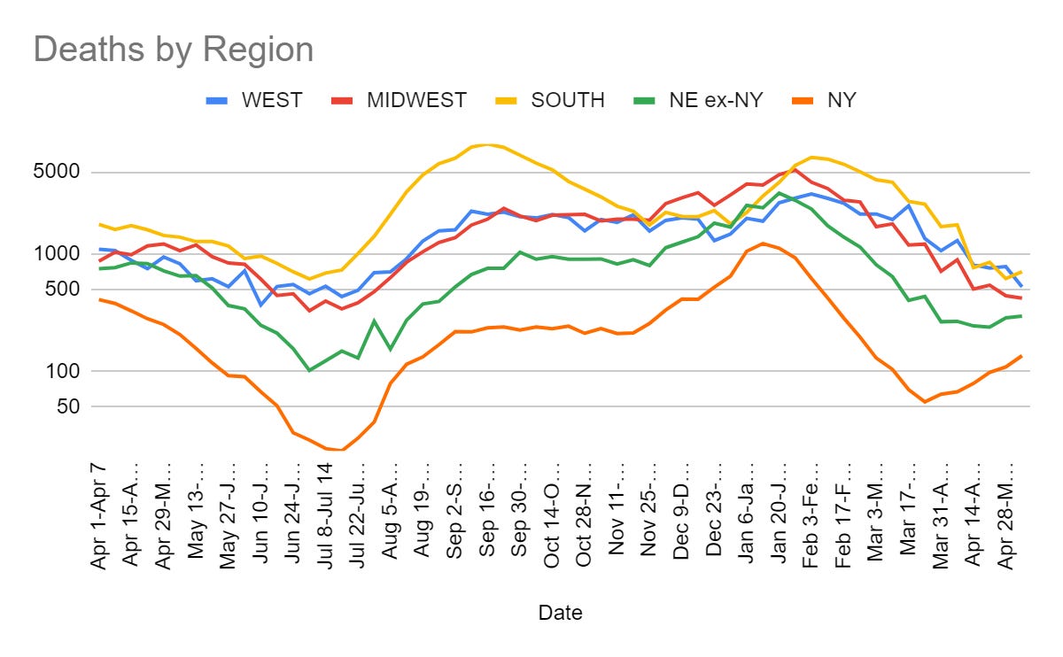 This is even more dramatic than it looks, with Florida effectively shifting over 100 deaths from last week forward into this one. The Northeast and New York lines do indicate that deaths will start going back up again at some point, but for now the ‘fading out’ of with-Covid cases and old cases continues to drop reported numbers. My guess is that ‘real’ Covid deaths have been rising, so once the backlogs are sufficiently cleared we should see deaths rise again. But we also need to adjust for Florida likely reporting nothing.
