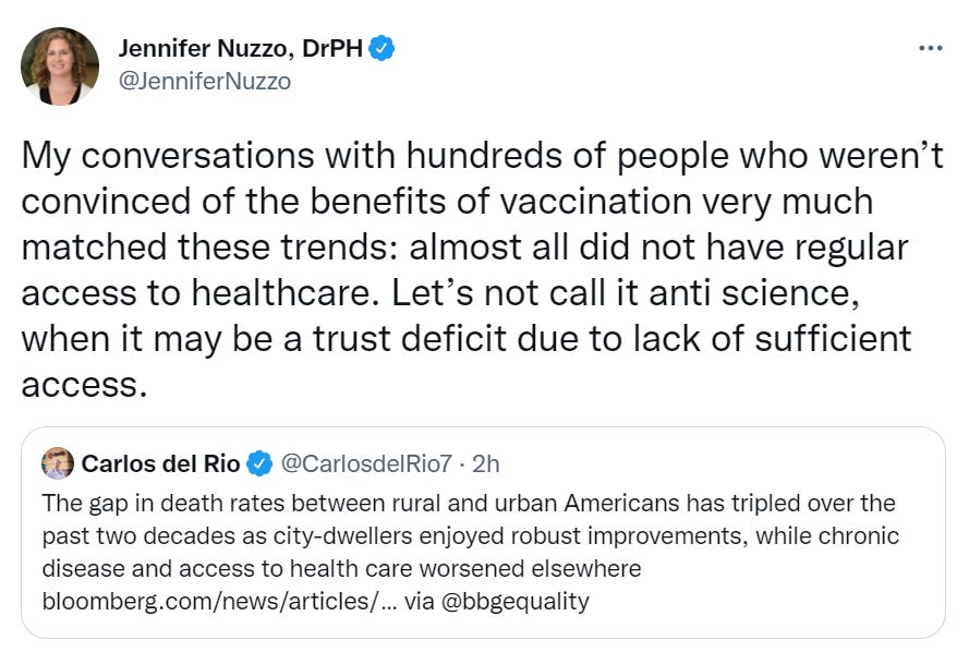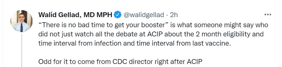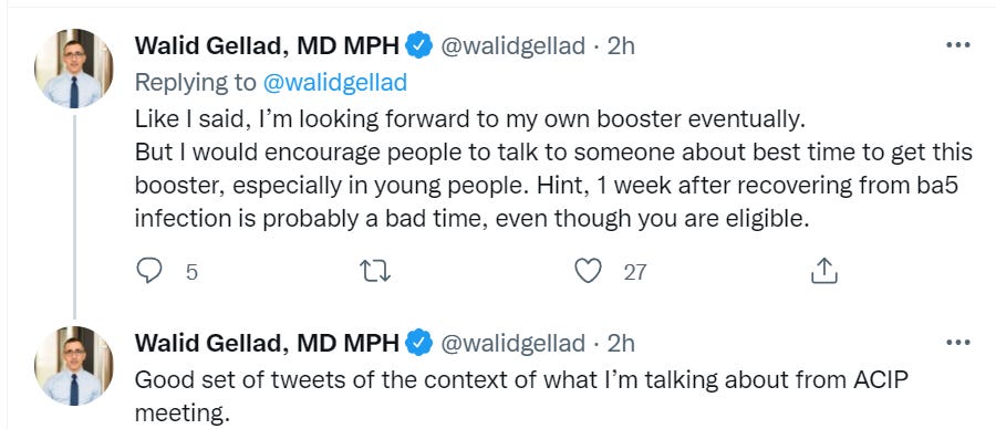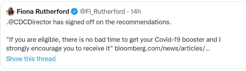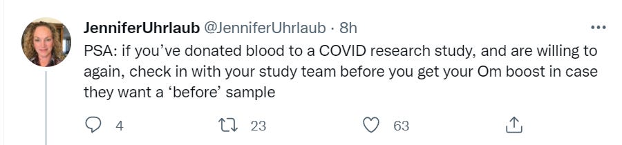 White House says Americans will ‘only’ need yearly booster going forward. NPR offers a variety of takes on where the thresholds should be and whether to time things for a bigger wave. Celine Gounder suggests focusing on timing your booster to be 2-4 weeks before visiting vulnerable relatives if you are healthy, and splitting up the Covid and Flu shots if you can. Your Local Epidemiologist couldn’t be more excited to get hers, and has detailed thoughts on exactly how long to wait after various things.