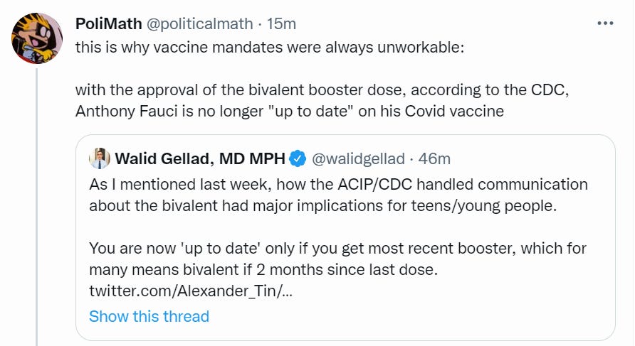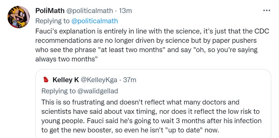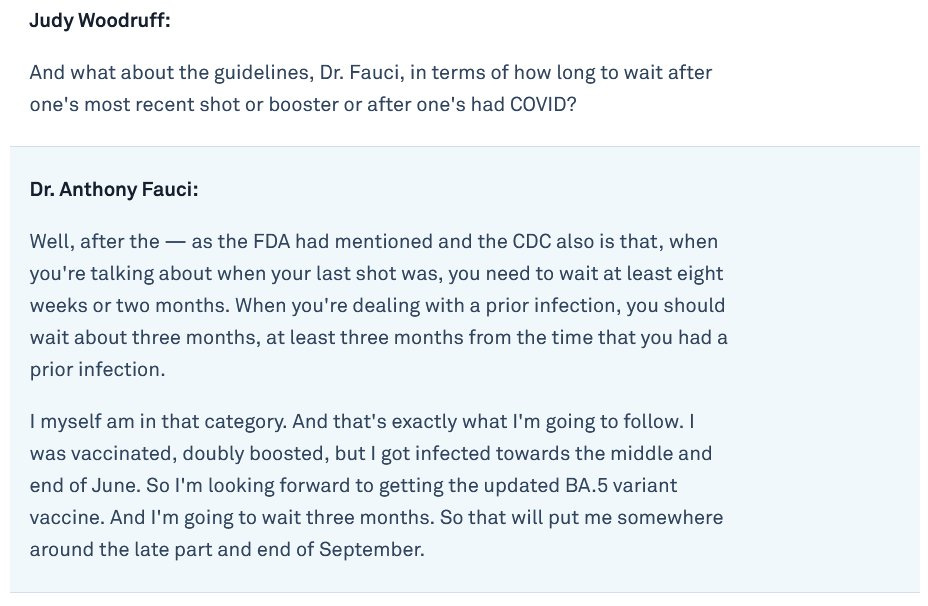 My decision means I will officially not be ‘up to date’ on my booster. Neither will be (for a time) Dr. Fauci, despite his willingness to get a third booster.