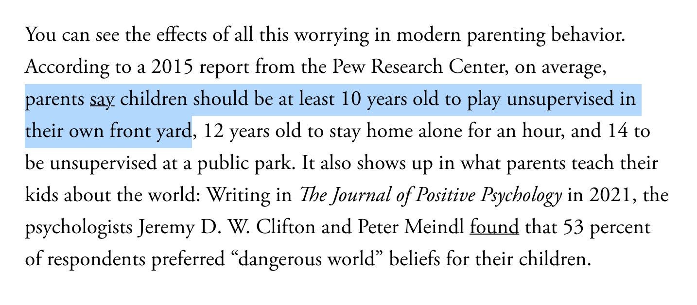 The obvious counter to that is well yes everyone is obsessed with safety and this is keeping kids safe, which is good. I can’t prove right now that this is not true and that safety obsession buys you very little real safety in 2022. I do strongly believe it, and the dangers from the things safety obsessions are mostly about are trivially small risks and always have been. Kidnapping by strangers, in particular, is vanishingly rare, and without that danger why in the world would you need to be 10 years old to play in your own front yard?